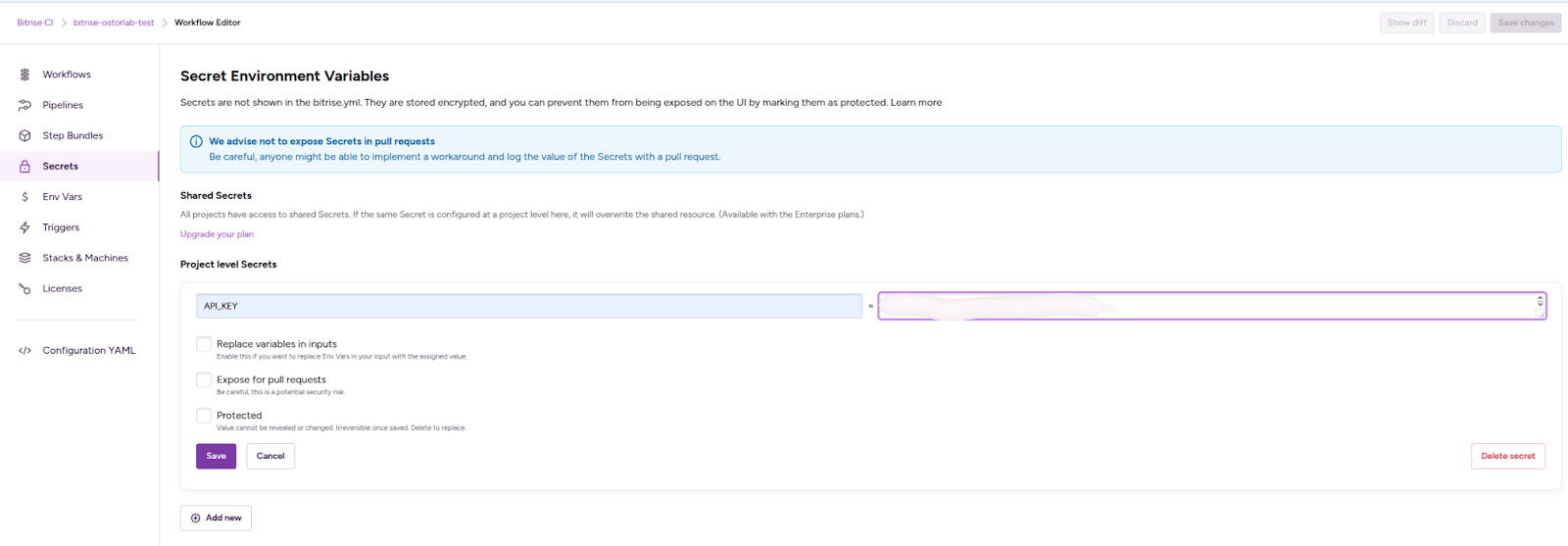 Added full documentation for integrating mobile security scanning into Bitrise workflows: generating API keys, configuring secrets, adding a Script step, and running the Ostorlab CLI.